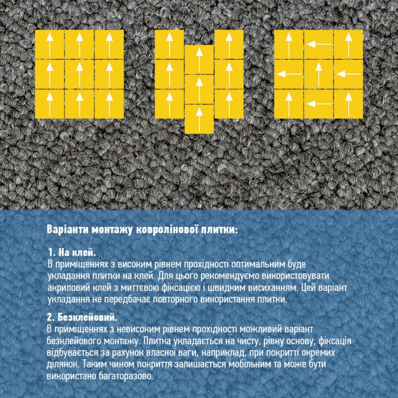 Необхідно переконатися, що поверхня, на яку передбачається клеїти плитку, відповідає вищезазначеним вимогам. У приміщенні не повинно бути протягів під час проведення монтажних робіт. Для надійної фіксації ковроліну у плиткахвикористовуйте: - Акриловий клей – наноситься тонкою смужкою по периметру плитки, приблизно 2 см від краю плитки. - Акрилово-дисперсійний (водно-дисперсійний) клей – наноситься суцільним шаром по всій зворотній поверхні плитки. Починайте монтаж з одного кута приміщення. Акуратно притискайте плитку до поверхні, контролюючи рівність укладання та уникаючи появи бульбашок і зморшок. Це забезпечить правильне позиціонування і основу для наступних плиток. Наступну плитку встановлюйте ребром до стику з попередньою. Притискайте рівномірно по всій площі, щоб досягти щільного прилягання та виключити утворення повітряних кишень. При необхідності обрізайте плитку за допомогою канцелярського ножа або ножиць, щоб підігнати її до розмірів приміщення та забезпечити акуратне завершення монтажу. Фінальна фіксація. Після укладання дайте клею повністю висохнути відповідно до інструкції виробника (зазвичай 24 години), перш ніж експлуатувати покриття. Це гарантує надійну фіксацію плиток і довговічність покриття.