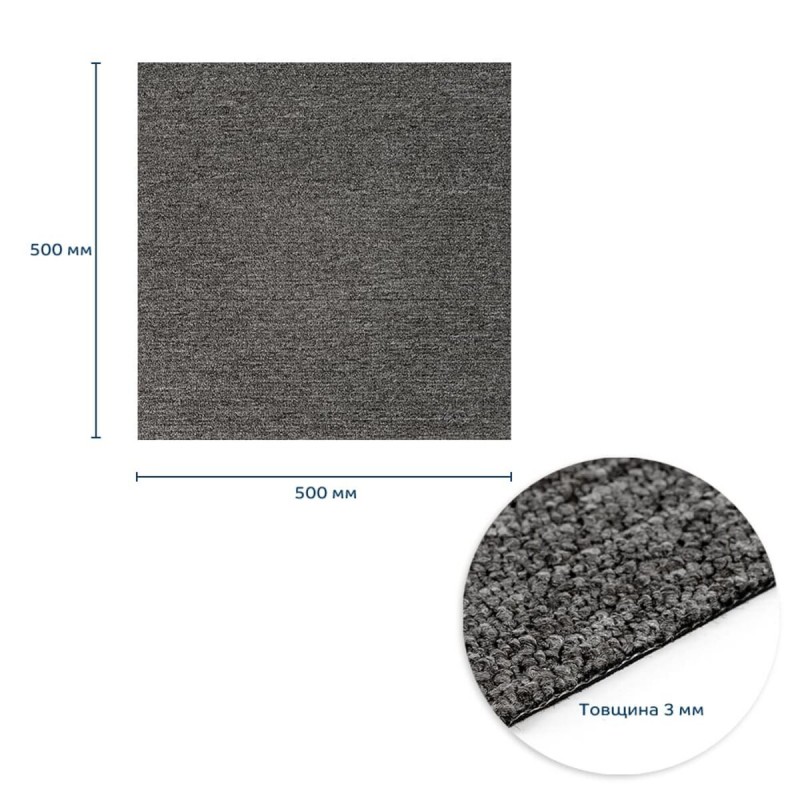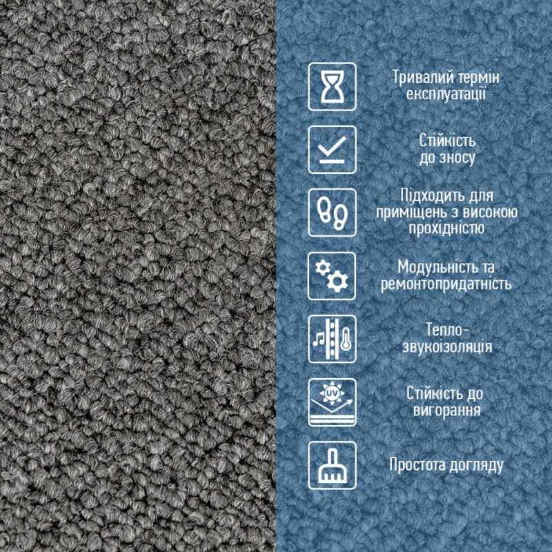 Легкість монтажу Процес укладання максимально простий і швидкий. Ковролін укладається стик у стик, його легко різати ножицями або монтажним ножем. Для надійного фіксування можна використовувати додатковий клей, що забезпечує міцне та рівне покриття без зазорів. Матеріал не набухає та не деформується, а між смугами не утворюються щілини. Зностостійкість та тривалий термін експлуатації Ковролін має щільний, густий ворс, який щільно прилягає і майже не піддається стиранню. Завдяки цьому покриття витримує інтенсивну експлуатацію навіть у приміщеннях з високою прохідністю, таких як коридори, офіси, магазини чи комерційні зони. Матеріал зберігає колір, структуру і форму під постійним навантаженням, забезпечуючи довговічність покриття та економію на ремонті. Стійкість до води та хімічних речовин Матеріал витримує контакт з вологою та побутовими мийними засобами, не пропускає воду і запобігає розвитку плісняви та грибка. Це робить його оптимальним для кухонь, коридорів та інших зон з підвищеною вологістю. Теплоізоляція Ковролін здатний утримувати тепло, створюючи комфортну температуру під ногами та знижуючи витрати на опалення в холодний сезон. Звукоізоляція Ковролінова плитка значно знижує рівень шуму в приміщенні, роблячи його більш комфортним і затишним. Це особливо важливо для квартир, офісів та комерційних просторів. Декоративні можливості Модульність матеріалу дозволяє створювати різноманітні комбінації дизайнів і кольорів. У наявності 6 стильних варіантів, що дає змогу підібрати ідеальне рішення під будь-який інтер’єр. Для неоднотонних позицій можна застосовувати варіативність розташування плиток, створюючи унікальні малюнки та декоративні ефекти. Догляд та чистка Покриття легко чиститься пилососом або вологим прибиранням. Завдяки своїй структурі, воно не накопичує бруд і пил, що забезпечує простий і швидкий догляд. Модульність і ремонтопридатність Кожна плитка окремо замінюється у разі пошкодження, що робить ремонт простим і економічним, без необхідності демонтажу всього покриття. Стабільність розмірів Плитки не деформуються з часом, зберігаючи чіткі геометричні параметри навіть при зміні температури та вологості. Розрахунок потрібної кількості матеріалу: