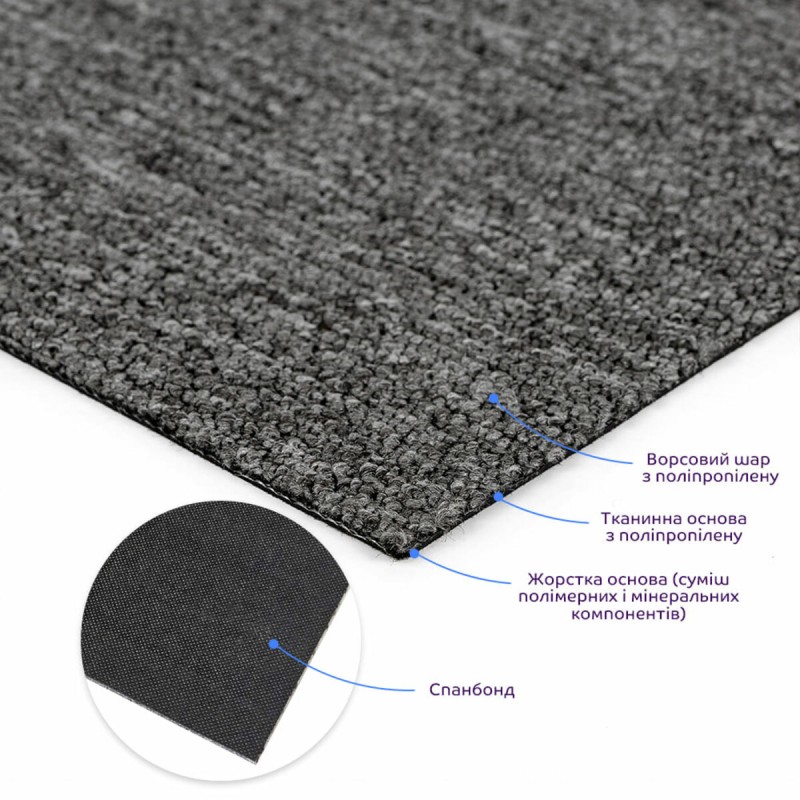 Ворс з поліпропіленового волокна : Верхній шар ковроліну — це ворс, який визначає зовнішній вигляд і тактильні відчуття покриття. Ворс зазвичай виготовлений із поліпропілену (PP) — синтетичних волокон, що добре тримають форму, не вбирають вологу та стійкі до стирання. Поліпропіленовий ворс має більш жорстку структуру, менше електризується та легше очищується, а також він приємний на дотик. Саме цей шар сприймає навантаження під час ходьби, тому його густота та висота впливають на зносостійкість покриття. Тканинна основа з поліпропілену. Під ворсом розташована тканинна основа, яку ще називають первинним підкладковим шаром. Вона нагадує за структурою поліпропіленовий мішок — це щільно сплетене полотно з плоских синтетичних ниток. Його завдання — фіксувати ворс і рівномірно розподіляти навантаження, щоб волокна не випадали й не деформувалися. Крім того, цей шар забезпечує стабільність геометрії ковроліну — він не розтягується і не стискається під час експлуатації. Жорстка основа — ключовий несучий шар класичного ковроліну у плитках, виготовлений із композитного матеріалу на основі полімерів і мінеральних компонентів, які після затвердіння формують міцну та стабільну основу, яка забезпечує ковроліну необхідну жорсткість, не дає плиткам деформуватися під час монтажу та експлуатації. Через відсутність гнучкості цього шару плитку не можна складати; при сильному вигині можливі тріщини по лінії перегину. Спанбонд — це нетканий матеріал, виготовлений із поліпропіленових (PP) волокон, які формуються у вигляді тонкої “павутини” розплавленого полімеру. Волокна рівномірно розподіляються та термічно спаюються між собою, утворюючи щільне однорідне полотно. Матеріал абсолютно не тягнеться, має стабільну форму, високу міцність на розрив і стирання, не вбирає вологу та не підтримує горіння. Завдяки цим властивостям спанбонд використовується як стабілізуючий шар у ковроліновій плитці — він зберігає форму покриття, запобігає деформації й робить матеріал довговічним. Застосування: внутрішні оздоблювальні роботи: декорування підлоги (можливо і стін) у всіх видах житлових приміщень (кухня, вітальня, дитяча або спальня, вхідна група) та широкого спектру комерційних приміщень (офісні приміщення, зони рецепцій, магазини, салони краси або фітнес-центри, місця громадської присутності, майстерні).