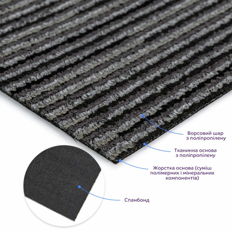 Ворс з поліпропіленового волокна : Верхній шар ковроліну — це ворс, який визначає зовнішній вигляд і тактильні відчуття покриття. Ворс зазвичай виготовлений із поліпропілену (PP) — синтетичних волокон, що добре тримають форму, не вбирають вологу та стійкі до стирання. Поліпропіленовий ворс має більш жорстку структуру, менше електризується та легше очищується, а також він приємний на дотик. Саме цей шар сприймає навантаження під час ходьби, тому його густота та висота впливають на зносостійкість покриття. Тканинна основа з поліпропілену. Під ворсом розташована тканинна основа, яку ще називають первинним підкладковим шаром. Вона нагадує за структурою поліпропіленовий мішок — це щільно сплетене полотно з плоских синтетичних ниток. Його завдання — фіксувати ворс і рівномірно розподіляти навантаження, щоб волокна не випадали й не деформувалися. Крім того, цей шар забезпечує стабільність геометрії ковроліну — він не розтягується і не стискається під час експлуатації. Жорстка основа — ключовий несучий шар класичного ковроліну у плитках, виготовлений із композитного матеріалу на основі полімерів і мінеральних компонентів, які після затвердіння формують міцну та стабільну основу, яка забезпечує ковроліну необхідну жорсткість, не дає плиткам деформуватися під час монтажу та експлуатації. Через відсутність гнучкості цього шару плитку не можна складати; при сильному вигині можливі тріщини по лінії перегину. Спанбонд — це нетканий матеріал, виготовлений із поліпропіленових (PP) волокон, які формуються у вигляді тонкої “павутини” розплавленого полімеру. Волокна рівномірно розподіляються та термічно спаюються між собою, утворюючи щільне однорідне полотно. Матеріал абсолютно не тягнеться, має стабільну форму, високу міцність на розрив і стирання, не вбирає вологу та не підтримує горіння. Завдяки цим властивостям спанбонд використовується як стабілізуючий шар у ковроліновій плитці — він зберігає форму покриття, запобігає деформації й робить матеріал довговічним. Застосування: внутрішні оздоблювальні роботи: декорування підлоги (можливо і стін) у всіх видах житлових приміщень (кухня, вітальня, дитяча або спальня, вхідна група) та широкого спектру комерційних приміщень (офісні приміщення, зони рецепцій, магазини, салони краси або фітнес-центри, місця громадської присутності, майстерні).