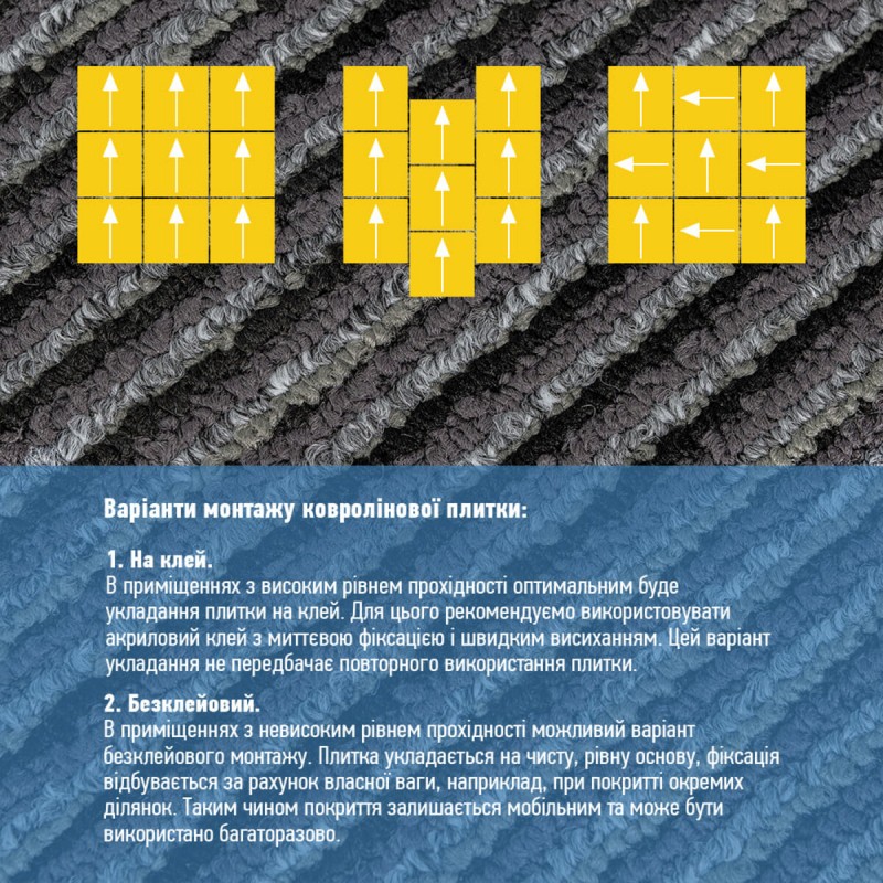 Необхідно переконатися, що поверхня, на яку передбачається клеїти плитку, відповідає вищезазначеним вимогам. У приміщенні не повинно бути протягів під час проведення монтажних робіт. Для надійної фіксації ковроліну у плиткахвикористовуйте: - Акриловий клей – наноситься тонкою смужкою по периметру плитки, приблизно 2 см від краю плитки. - Акрилово-дисперсійний (водно-дисперсійний) клей – наноситься суцільним шаром по всій зворотній поверхні плитки. Починайте монтаж з одного кута приміщення. Акуратно притискайте плитку до поверхні, контролюючи рівність укладання та уникаючи появи бульбашок і зморшок. Це забезпечить правильне позиціонування і основу для наступних плиток. Наступну плитку встановлюйте ребром до стику з попередньою. Притискайте рівномірно по всій площі, щоб досягти щільного прилягання та виключити утворення повітряних кишень. При необхідності обрізайте плитку за допомогою канцелярського ножа або ножиць, щоб підігнати її до розмірів приміщення та забезпечити акуратне завершення монтажу. Фінальна фіксація. Після укладання дайте клею повністю висохнути відповідно до інструкції виробника (зазвичай 24 години), перш ніж експлуатувати покриття. Це гарантує надійну фіксацію плиток і довговічність покриття.