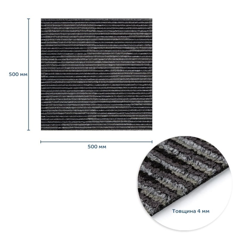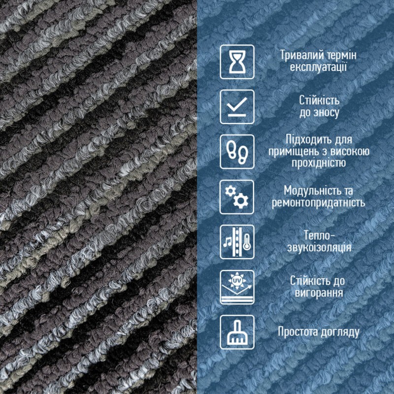 Легкість монтажу Процес укладання максимально простий і швидкий. Ковролін укладається стик у стик, його легко різати ножицями або монтажним ножем. Для надійного фіксування можна використовувати додатковий клей, що забезпечує міцне та рівне покриття без зазорів. Матеріал не набухає та не деформується, а між смугами не утворюються щілини. Зностостійкість та тривалий термін експлуатації Ковролін має щільний, густий ворс, який щільно прилягає і майже не піддається стиранню. Завдяки цьому покриття витримує інтенсивну експлуатацію навіть у приміщеннях з високою прохідністю, таких як коридори, офіси, магазини чи комерційні зони. Матеріал зберігає колір, структуру і форму під постійним навантаженням, забезпечуючи довговічність покриття та економію на ремонті. Стійкість до води та хімічних речовин Матеріал витримує контакт з вологою та побутовими мийними засобами, не пропускає воду і запобігає розвитку плісняви та грибка. Це робить його оптимальним для кухонь, коридорів та інших зон з підвищеною вологістю. Теплоізоляція Ковролін здатний утримувати тепло, створюючи комфортну температуру під ногами та знижуючи витрати на опалення в холодний сезон. Звукоізоляція Ковролінова плитка значно знижує рівень шуму в приміщенні, роблячи його більш комфортним і затишним. Це особливо важливо для квартир, офісів та комерційних просторів. Декоративні можливості Модульність матеріалу дозволяє створювати різноманітні комбінації дизайнів і кольорів. У наявності 6 стильних варіантів, що дає змогу підібрати ідеальне рішення під будь-який інтер’єр. Для неоднотонних позицій можна застосовувати варіативність розташування плиток, створюючи унікальні малюнки та декоративні ефекти. Догляд та чистка Покриття легко чиститься пилососом або вологим прибиранням. Завдяки своїй структурі, воно не накопичує бруд і пил, що забезпечує простий і швидкий догляд. Модульність і ремонтопридатність Кожна плитка окремо замінюється у разі пошкодження, що робить ремонт простим і економічним, без необхідності демонтажу всього покриття. Стабільність розмірів Плитки не деформуються з часом, зберігаючи чіткі геометричні параметри навіть при зміні температури та вологості. Розрахунок потрібної кількості матеріалу: