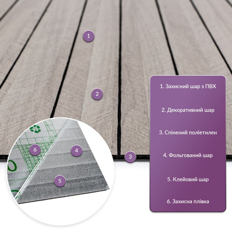 • Декоративний шар: плівка з кольоровим друком високої роздільної якості, яка повністю імітує фактуру природних матеріалів завдяки чіткому та деталізованому зображенню.