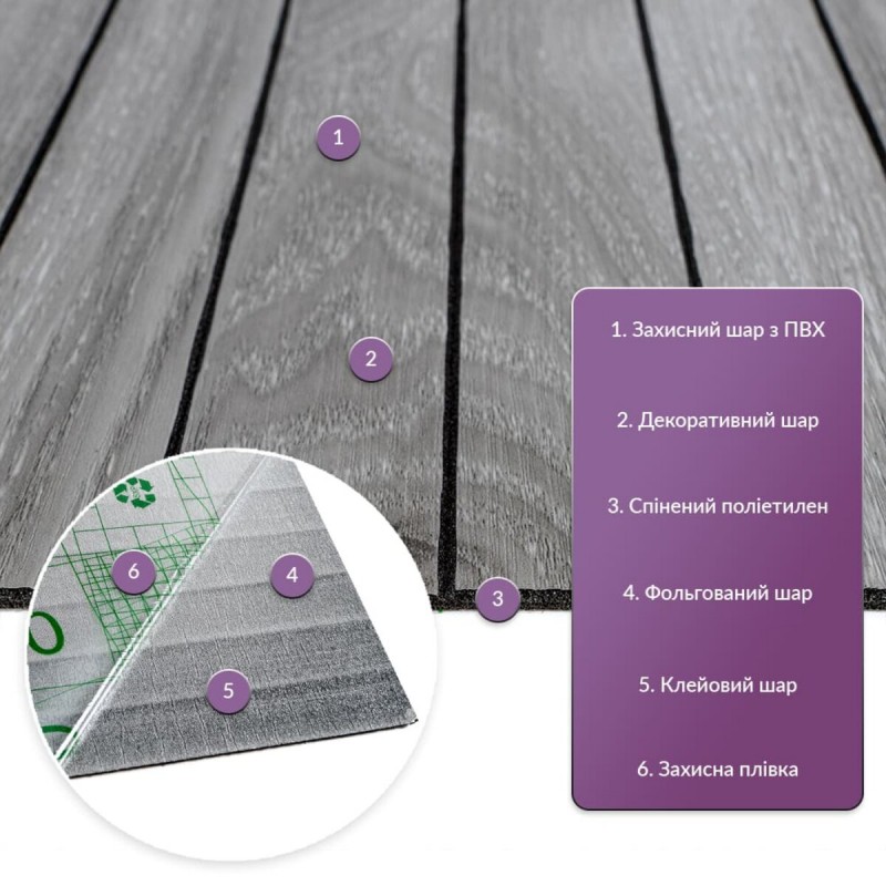 • Декоративний шар: плівка з кольоровим друком високої роздільної якості, яка повністю імітує фактуру природних матеріалів завдяки чіткому та деталізованому зображенню.