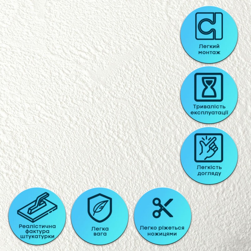Гнучкість без деформації Матеріал є еластичним і легко згинається, що дозволяє монтувати його на нерівні та складні поверхні. Завдяки вбудованій армувальній сітці штукатурка не розтягується, не створює заломів і не деформується під час монтажу або експлуатації. Це гарантує стабільну геометрію та акуратний вигляд після наклеювання. Самоклеюча основа Шар клею забезпечує швидке та зручне встановлення без додаткових інструментів і матеріалів. Монтаж займає мінімум часу: смуги клеяться стик-у-стик, рівно лягають на поверхню та не розходяться. Матеріал легко ріжеться ножицями або монтажним ножем. Стійкість до вологи та пари Гнучка штукатурка не вбирає воду, не набухає та не деформується під впливом вологи. Матеріал стійкий до пари, не сприяє утворенню плісняви та підходить для приміщень із підвищеною вологістю — кухонь, ванних кімнат. Може застосовуватися в зоні кухонного фартуха (за умови відступу від плити на 25-30 см). Підвищена міцність та зносостійкість Комбінація вінілу та армувальної сітки забезпечує матеріалу довговічність. Покриття не тріскається, не кришиться і добре витримує щоденне використання без втрати зовнішнього вигляду. Невибагливість у догляді Поверхня легко очищається вологою серветкою чи нейтральними мийними засобами. У разі пошкодження елемента його можна швидко замінити без демонтажу всієї поверхні. Тепло- та звукоізоляційні властивості Завдяки структурі матеріал помірно приглушує звуки та покращує теплоізоляцію стін, створюючи більш комфортні умови в приміщенні. Екологічна безпека Матеріал виготовляється з безпечної сировини, не виділяє шкідливих речовин, підходить для житлових приміщень та є нетоксичним для навколишнього середовища. Розрахунок необхідної кількості матеріалу