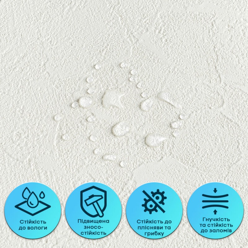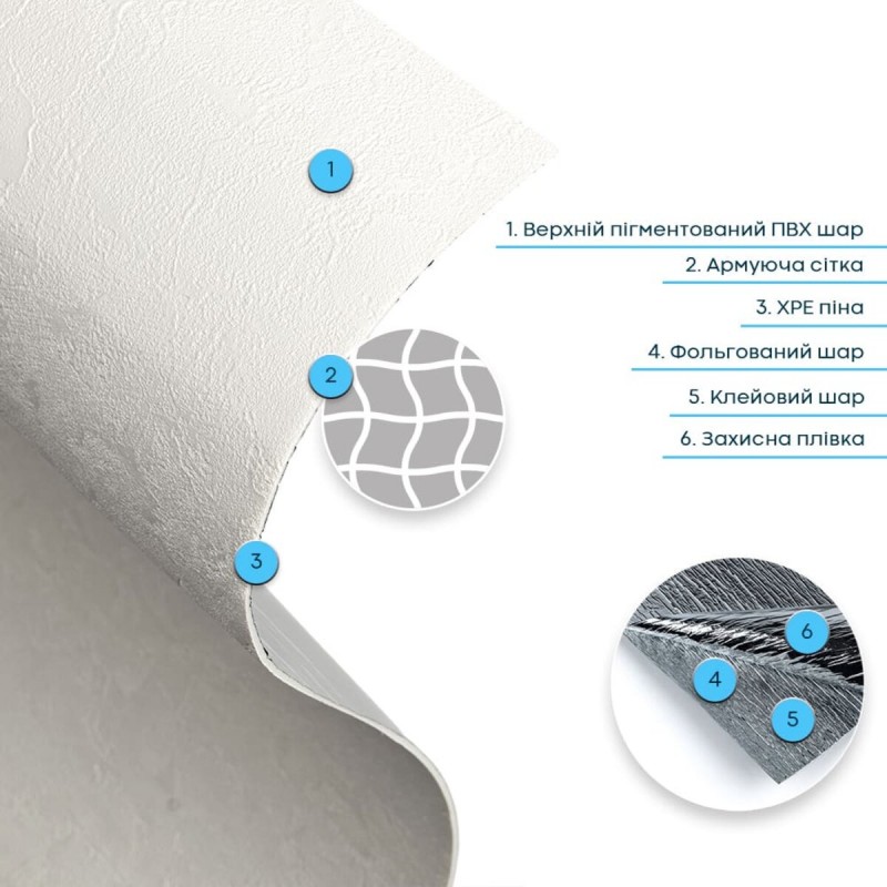 Пігментований ПВХ шар — це декоративний верхній шар із полівінілхлориду з додаванням пігментів та стабілізаторів, які забезпечують стійкість кольору та захист від УФ-випромінювання. Цей шар формує детальну фактуру й дизайн матеріалу, максимально наближені до декоративної штукатурки, включаючи дрібні нерівності та текстурні вкраплення. Він стійкий до вологи та впливу хімічних речовин, дуже гнучкий, не схильний до заломів і має здатність відновлювати форму після деформації. Армувальна сітка — це внутрішній зміцнювальний шар, який підвищує стабільність і міцність верхнього шару ПВХ. Виготовлена зі синтетичного матеріалу, вона не розтягується, допомагає зберігати форму та фактуру під час монтажу й експлуатації, а також запобігає деформаціям матеріалу. ХРЕ (спінений поліетилен) — це матеріал, який роблять із поліетилену, спеціально переплавляючи його та “зшиваючи” молекули між собою. Завдяки такій технології матеріал стає міцнішим і краще витримує температуру. Усередині ХРЕ є багато дрібних закритих комірок — саме через це він виходить легким, пружним і добре утримує тепло. Закрита структура також робить його стійким до вологи та довговічним у використанні. Фольгований шар виконує дві ключові функції: він відбиває теплові хвилі, забезпечуючи додаткову теплоізоляцію, а також захищає матеріал від вологи. Завдяки цьому шпалери стають більш стійкими до вологого середовища та чудово підходять для використання на кухнях. Окрім цього, фольгований шар додатково зміцнює ХРЕ-основу, запобігаючи її розтягуванню та зберігаючи форму матеріалу під час монтажу та експлуатації. Подвійний клейовий шар: нетоксична основа з високим рівнем адгезії. Захисна фольгована плівка: оберігає клейовий шар від пересихання та забруднення, легко знімається під час монтажу. Застосування: внутрішні оздоблювальні роботи: декорування стін у всіх видах житлових приміщень (кухня, ванна кімната, вітальня, дитяча або спальня, вхідна група) та комерційних приміщень (офісні приміщення, зони рецепцій, магазини, салони краси або фітнес-центри, місця громадської присутності, майстерні), меблів, дверей та інших рівних поверхонь.