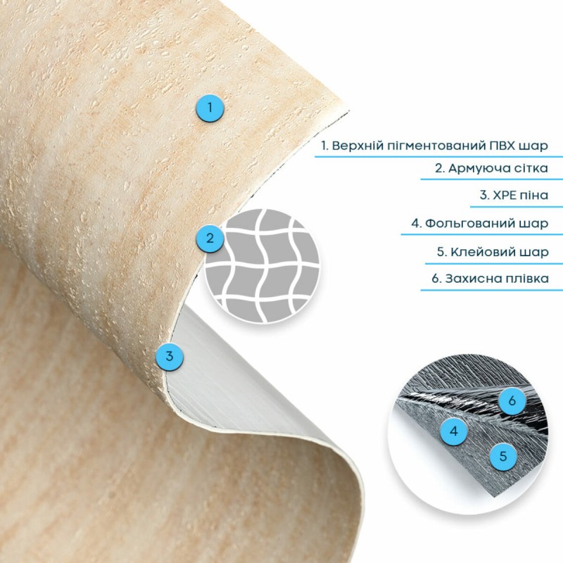 • Армувальна сітка — це внутрішній зміцнювальний шар, який підвищує стабільність і міцність верхнього шару ПВХ. Виготовлена зі синтетичного матеріалу, вона не розтягується, допомагає зберігати форму та фактуру під час монтажу й експлуатації, а також запобігає деформаціям матеріалу.