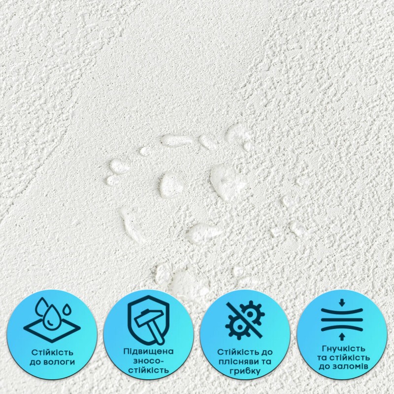 • Стійкість до вологи та пари Гнучка штукатурка не вбирає воду, не набухає та не деформується під впливом вологи. Матеріал стійкий до пари, не сприяє утворенню плісняви та підходить для приміщень із підвищеною вологістю — кухонь, ванних кімнат. Може застосовуватися в зоні кухонного фартуха (за умови відступу від плити на 25-30 см).