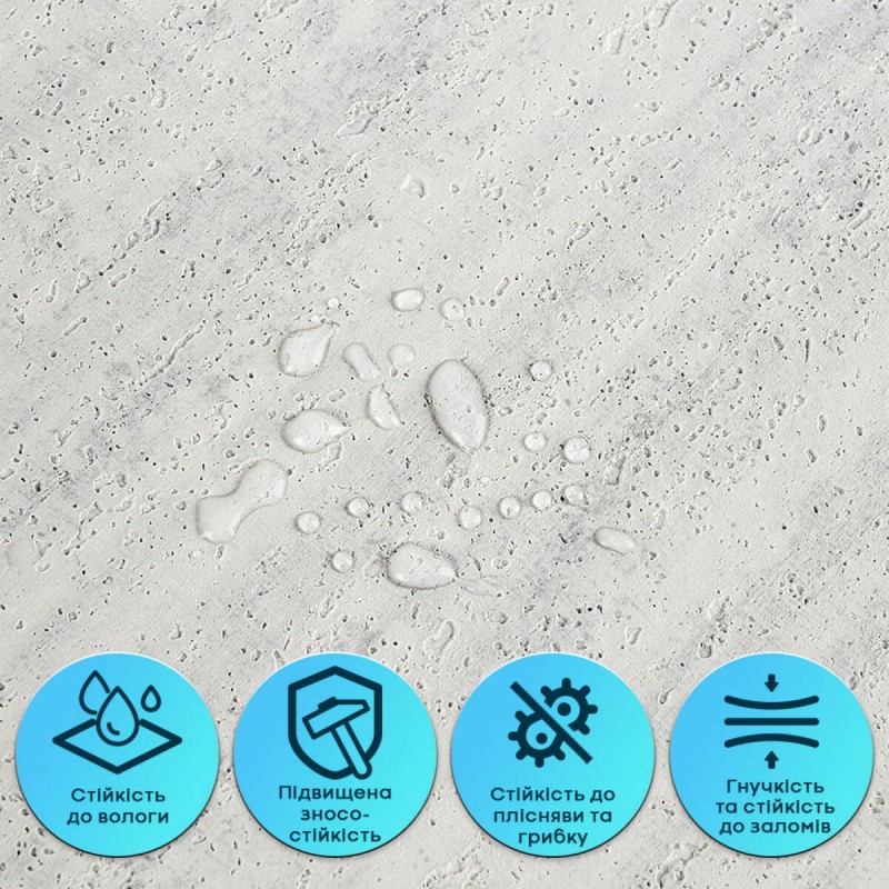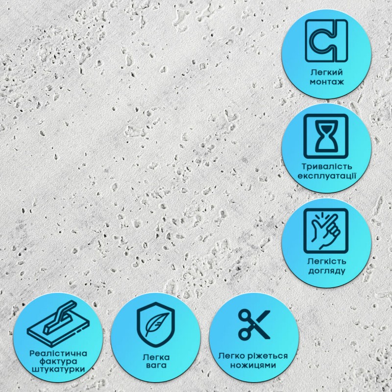 Гнучкість без деформації Матеріал є еластичним і легко згинається, що дозволяє монтувати його на нерівні та складні поверхні. Завдяки вбудованій армувальній сітці штукатурка не розтягується, не створює заломів і не деформується під час монтажу або експлуатації. Це гарантує стабільну геометрію та акуратний вигляд після наклеювання. Самоклеюча основа Шар клею забезпечує швидке та зручне встановлення без додаткових інструментів і матеріалів. Монтаж займає мінімум часу: смуги клеяться стик-у-стик, рівно лягають на поверхню та не розходяться. Матеріал легко ріжеться ножицями або монтажним ножем. Стійкість до вологи та пари Гнучка штукатурка не вбирає воду, не набухає та не деформується під впливом вологи. Матеріал стійкий до пари, не сприяє утворенню плісняви та підходить для приміщень із підвищеною вологістю — кухонь, ванних кімнат. Може застосовуватися в зоні кухонного фартуха (за умови відступу від плити на 25-30 см). Підвищена міцність та зносостійкість Комбінація вінілу та армувальної сітки забезпечує матеріалу довговічність. Покриття не тріскається, не кришиться і добре витримує щоденне використання без втрати зовнішнього вигляду. Невибагливість у догляді Поверхня легко очищається вологою серветкою чи нейтральними мийними засобами. У разі пошкодження елемента його можна швидко замінити без демонтажу всієї поверхні. Тепло- та звукоізоляційні властивості Завдяки структурі матеріал помірно приглушує звуки та покращує теплоізоляцію стін, створюючи більш комфортні умови в приміщенні. Екологічна безпека Матеріал виготовляється з безпечної сировини, не виділяє шкідливих речовин, підходить для житлових приміщень та є нетоксичним для навколишнього середовища. Розрахунок необхідної кількості матеріалу