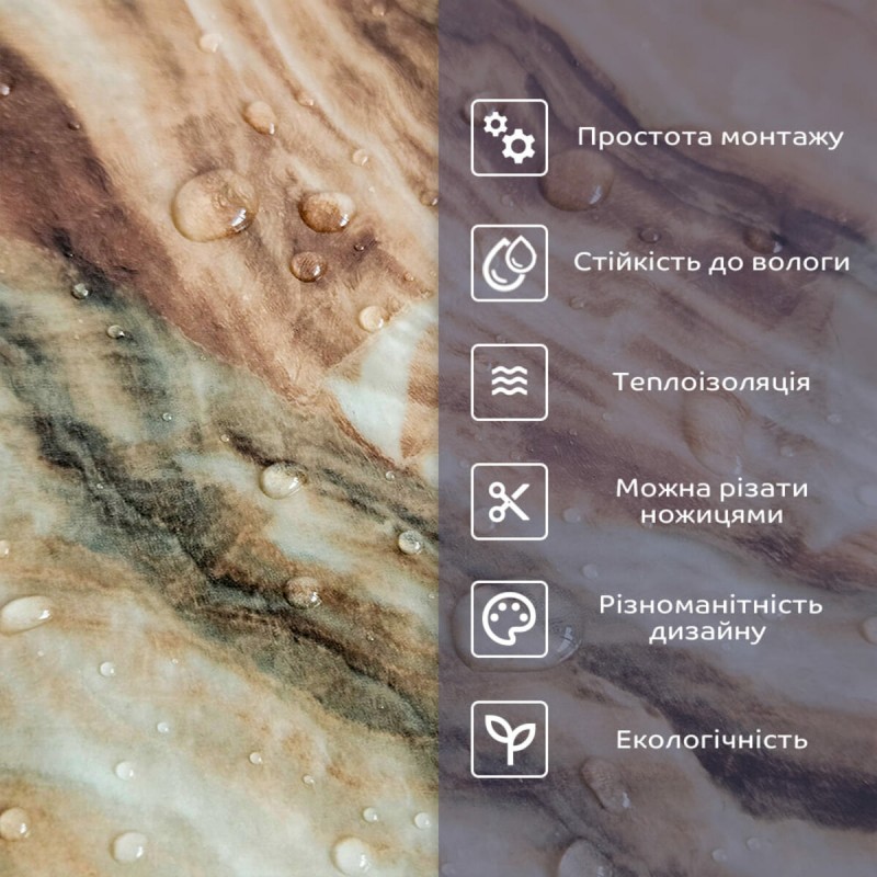 - 2. Стійкість до вологи: матеріал стійкий до впливу вологи та пари, а також до появи плісняви, що робить його придатним для використання у приміщеннях з високою вологістю, таких як ванни та кухні. Плитка підходить для створення фартуха кухні, можна клеїти біля плити на відстані не менше ніж 20-25 см;