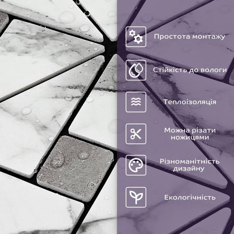 - Стійкість до вологи: матеріал стійкий до впливу вологи та пари, а також до появи плісняви, що робить його придатним для використання у приміщеннях з високою вологістю, таких як ванни та кухні. Плитка підходить для створення фартуха кухні, можна клеїти біля плити на відстані не менше ніж 20-25 см;