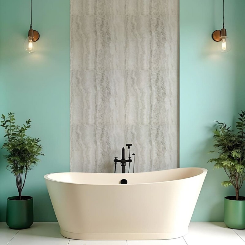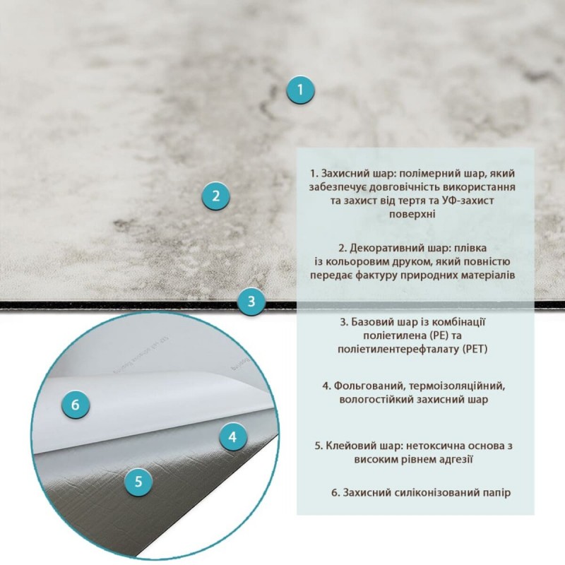 Полімерний шар, що захищає від потертостей та дрібних механічних пошкоджень, забезпечує довговічність використання, а УФ захист допомагає запобігти вигоранню, зберігаючи колір насиченим, внаслідок чого плитка довго має свій первісний естетичний вигляд. Декоративний шар: плівка з кольоровим друком високої якості, яка повністю імітує фактуру природних матеріалів завдяки чіткому та деталізованому зображенню. Основний шар з спіненого поліетилентерефталату - це полімер, що складається з довгих ланцюгів молекул вінілхлориду, в яких містяться атоми хлору, це надає матеріалу стійкість до впливу хімічних речовин. ПВХ є аморфним полімером, така особливість будови робить його пружним та ударостійким, а завдяки стабілізаторам та пом'якшувачам, матеріал має малу вагу. Клейовий шар: нетоксична основа з високим рівнем адгезії. Захисний силіконізований папір – оберігає клейовий шар від пересихання та забруднення, легко знімається під час монтажу. Застосування: внутрішні оздоблювальні роботи: декорування стін у житлових приміщеннях з підвищеним рівнем вологості та на робочих поверхнях (кухня, ванна кімната, вітальня, вхідна група) та комерційних приміщень (офісні приміщення, зони рецепцій, магазини, салони краси або фітнес-центри, місця громадської присутності, майстерні), меблів, дверей та інших рівних поверхонь.