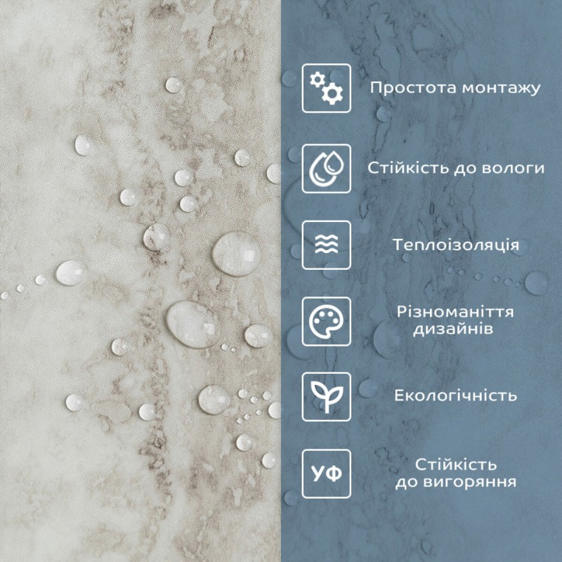 Легка установка: самоклеючий шар робить процес укладання швидким і простим, не вимагаючи додаткового клею, додаткових матеріалів чи спеціалістів. Матеріал укладається стик в стик, його можна різати ножицями чи монтажним ножем, між смугами не розходиться, не набухає і не деформується. Відсоток обрізу становить 1%, що є найкращим показником для настінних покриттів; Стійкість до вологи: вінілова плитка стійка до вологи, що робить її відмінним вибором для ванних кімнат, кухонь та інших приміщень з підвищеною вологістю, матеріал стійкий також до впливу пари, а також до появи плісняви. Плитка підходить для створення фартуха кухні, можна клеїти біля плити на відстані не менше ніж 30-50 см; Довговічність: міцність та зносостійкість вінілу дозволяє плитці залишатися в первинному стані протягом тривалого періоду часу; Естетична складова: широкий вибір дизайнів та кольорів (імітація натуральних матеріалів та абстракції) дає можливість підібрати покриття, яке відповідає вашому стилю та інтер'єру, дуже добре комбінується за гамою кольорів, дозволяючи створити власний дизайн приміщення; Легкий догляд: вініл легко очищається і не вимагає спеціальних засобів для чищення. Ізоляція: плитка має тепло та звукоізоляційні властивості; Екологічна безпека: вінілову плитку виготовляють з відновлювальних ресурсів, а сам матеріал безпечний для здоров'я та навколишнього середовища. Розрахунок потрібної кількості матеріалу: