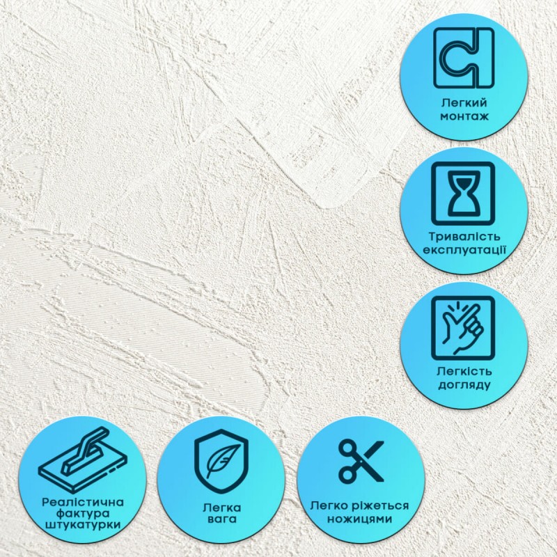 Гибкость без деформации Материал эластичен и легко изгибается, что позволяет монтировать его на неровные и сложные поверхности. Благодаря встроенной армирующей сетке штукатурка не растягивается, не создает изломов и не деформируется при монтаже или эксплуатации. Это гарантирует стабильную геометрию и аккуратный вид после наклеивания. Самоклеющая основа Слой клея обеспечивает быструю и удобную установку без дополнительных инструментов и материалов. Монтаж занимает минимум времени: полосы клеятся стык в стык, ровно ложатся на поверхность и не расходятся. Материал легко режется ножницами или монтажным ножом. Устойчивость к влаге и пару Гибкая штукатурка не впитывает воду, не набухает и не деформируется под воздействием влаги. Материал устойчив к парам, не способствует образованию плесени и подходит для помещений с повышенной влажностью — кухонь, ванных комнат. Может применяться в зоне кухонного фартука (при отступлении от плиты на 25-30 см). Повышенная прочность и износостойкость Комбинация винила и армирующей сетки обеспечивает материалу долговечность. Покрытие не трескается, не крошится и хорошо выдерживает ежедневное использование без потери внешнего вида. Неприхотливость в уходе Поверхность легко очищается влажной салфеткой или нейтральными моющими средствами. В случае повреждения элемента можно быстро заменить его без демонтажа всей поверхности. Тепло- и звукоизоляционные свойства Благодаря структуре материал умеренно скрадывает звуки и улучшает теплоизоляцию стен, создавая более комфортные условия в помещении. Экологическая безопасность Материал изготавливается из безопасного сырья, не выделяет вредных веществ, подходит для жилых помещений и является нетоксичным для окружающей среды. Расчет необходимого количества материала