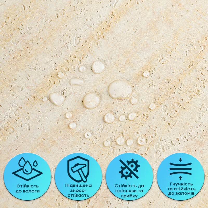 • Устойчивость к влаге и пару Гибкая штукатурка не впитывает воду, не набухает и не деформируется под воздействием влаги. Материал устойчив к парам, не способствует образованию плесени и подходит для помещений с повышенной влажностью — кухонь, ванных комнат. Может применяться в зоне кухонного фартука (при отступлении от плиты на 25-30 см).