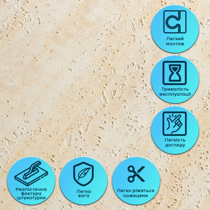 • Гибкость без деформации Материал эластичен и легко изгибается, что позволяет монтировать его на неровные и сложные поверхности. Благодаря встроенной армирующей сетке штукатурка не растягивается, не создает изломов и не деформируется при монтаже или эксплуатации. Это гарантирует стабильную геометрию и аккуратный вид после наклеивания.