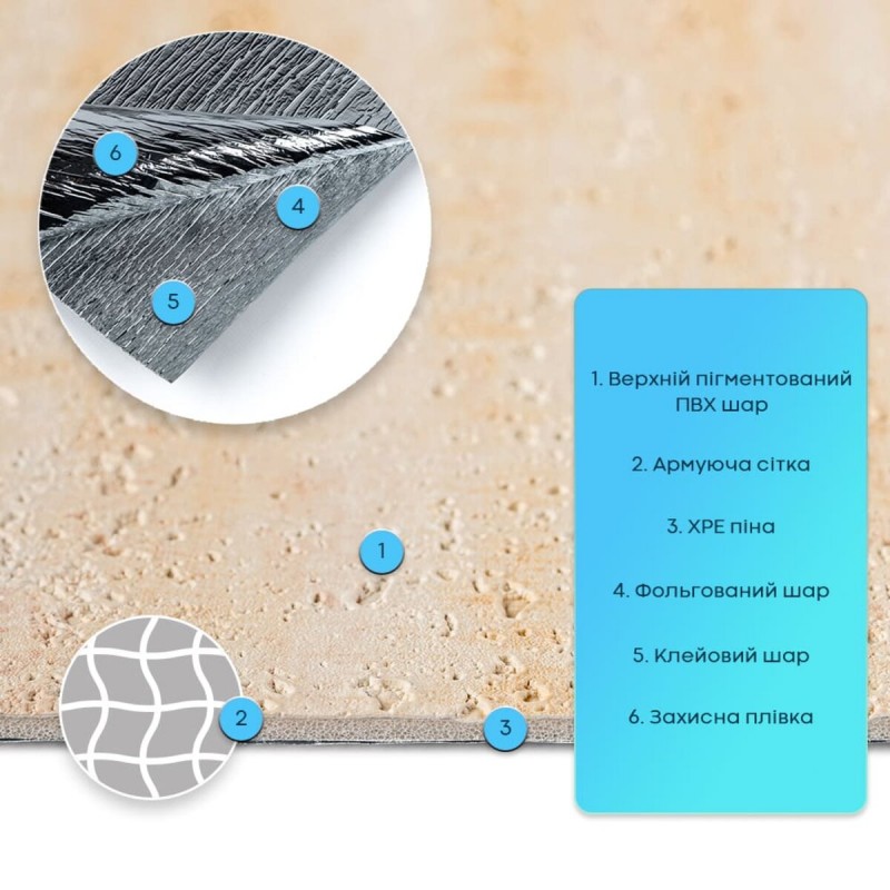 • Пигментированный ПВХ слой — это декоративный верхний слой из поливинилхлорида с добавлением пигментов и стабилизаторов, обеспечивающих цветостойкость и защиту от УФ-излучения. Этот пласт формирует детальную фактуру и дизайн материала, максимально приближенные к декоративной штукатурке, включая мелкие неровности и текстурные вкрапления. Он устойчив к влаге и воздействию химических веществ, очень гибок, не подвержен заломам и обладает способностью восстанавливать форму после деформации.