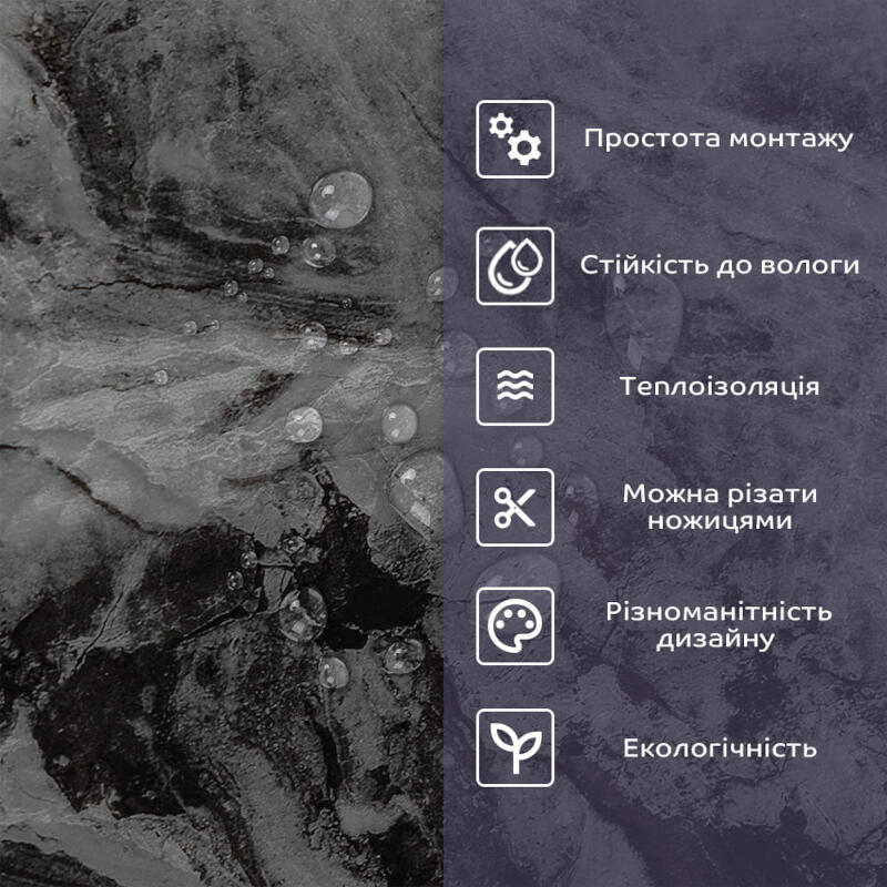 - 1. Легкість та міцність: плитка легка та міцна, що спрощує її логістику, установку та забезпечує довгий термін служби. Матеріал легкий в установці, можна різати ножицями чи монтажним ножем, не потребує додаткових матеріалів чи спеціалістів. Між смугами не розходиться, не роздмухується і не деформується. Відсоток обрізу становить 1%, що є найкращим показником для настінних покриттів;
